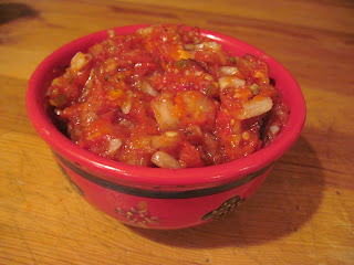 Cut tomatoes in half, lengthwise. On a foil lined sheet pan roast tomatoes and garlic in a 300 degree oven for 45 min. Remove skin from garlic and remove skin and seeds from peppers. In food processor mix peppers, tomatoes, onions, garlic pulse just a few times. You can also chop them up for a chunkier version. Add lime juice, cilantro and salt and stir. You can add less peppers for a less spicy version. I like to serve these with whole grain tortilla chips or (my favorite) blue corn tortill chips. Note- if you're in a hurry you can do the peppers ahead of time and add fresh tomatoes without roasting them.